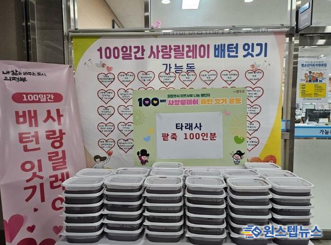 원스텝뉴스 이병희 기자 | 의정부시 가능동주민센터는 12월 19일 한국불교태고종 타래사가 동지를 맞아 팥죽 100그릇을 기탁하며 ‘100일간 사랑릴레이 배턴 잇기’에 동참했다고 밝혔다.