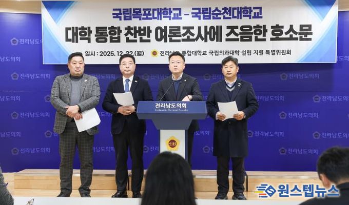 원스텝뉴스 이병희 기자 | 전라남도의회 통합대학교 국립의과대학 설립 지원 특별위원회는 교육부 통폐합 심사위원회 결정을 앞두고 오늘부터(22~23일) 진행 중인 국립목포대학교–국립순천대학교 통합 찬반 투표와 관련해, 양 대학 구성원의 적극적인 관심과 참여를 촉구하는 호소문을 12월 22일 발표했다.