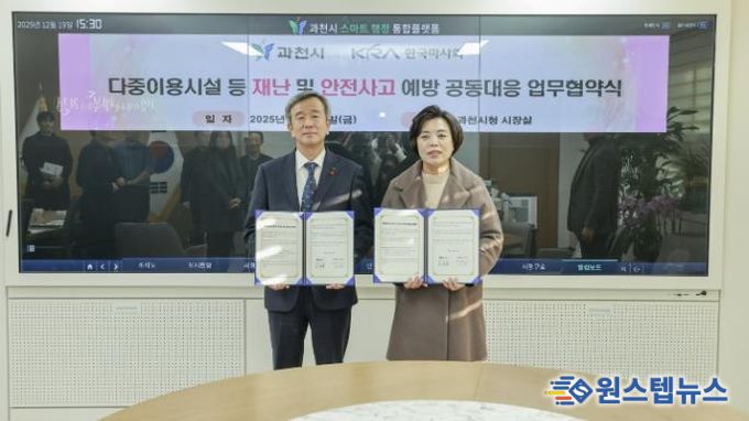 원스텝뉴스 이병희 기자 | 과천시는 지난 19일 한국마사회와 ‘재난 안전 강화를 위한 공동대응’ 업무협약을 체결했다고 22일 밝혔다. 이번 협약은 재난 발생 시 신속한 대응 체계를 마련하고, 지역사회 안전 관리 역량을 높이기 위해 추진됐다.
