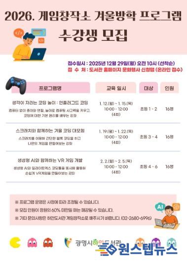 원스텝뉴스 천규영 기자 | 광명시 게임창작소는 오는 29일 오전 10시부터 겨울방학 프로그램 수강생을 모집한다.