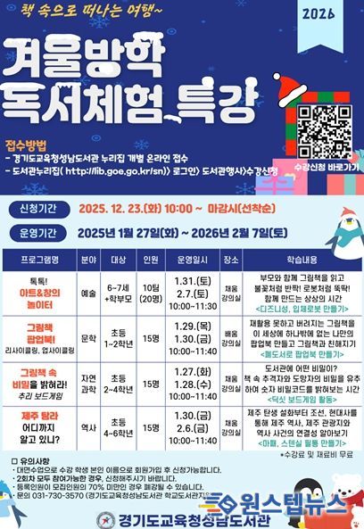 ‘겨울방학 독서교실과 겨울방학 독서체험 특강’의 참가자는 23일부터 경기도교육청성남도서관 누리집을 통해 선착순으로 모집한다.