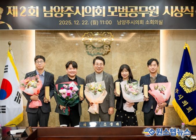 이날 수상자는 총 4명으로 각 상임위원회와 의회사무국 내 추천과 평가를 통해 평소 의정 및 시정발전에 기여한 공로를 인정받아 선정됐으며, △의회사무국 의사팀 최정인 팀장 △지역경제과 기업 SOS팀 권태준 팀장 △복지정책과 복지정책팀 박세현 팀장 △도로건설과 도로건설2팀 이원준 팀장이 수상의 영예을 안았다. 수상자에게는 표창패와 ‘남양주시의회 모범공무원 포상 운영 규칙’에 따라 2일 이내의 특별휴가가 부여될 예정이다.