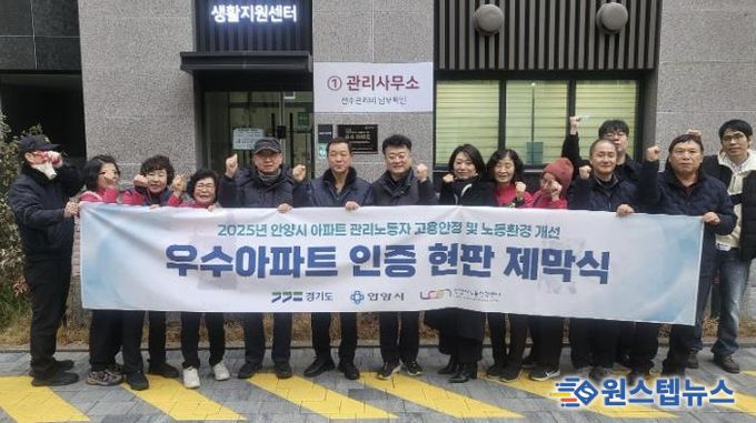 원스텝뉴스 이병희 기자 | 안양시노동인권센터는 지난 20일 ‘2025년 고용안정 및 노동환경 개선 우수아파트’로 선정된 래미안안양메가트리아와 힐스테이트인덕원역베르텍스 아파트에서 ‘우수아파트 인증 현판식’을 진행했다고 23일 밝혔다.