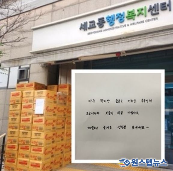 23일 오전, 세교동 행정복지센터 입구에는 이름을 밝히지 않은 기부자가 남기고 간 메모와 라면 100상자가 놓여 있었다.