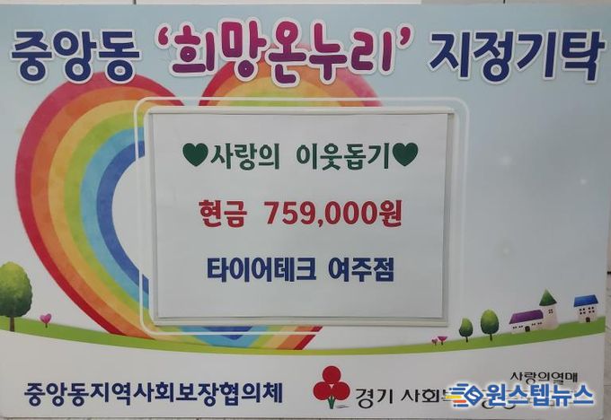 원스텝뉴스 이병희 기자 | 타이어테크 여주점은 지난 23일 연말을 맞아 지역사회 취약계층을 돕기 위해 성금 75만9천원을 중앙동행정복지센터에 기탁했다.