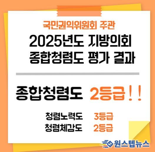 원스텝뉴스 이병희 기자 | 서산시의회는 지난 23일 국민권익위원회(이하 국민권익위)가 발표한 ‘2025년 종합청렴도 평가’에서 2등급을 달성했다.