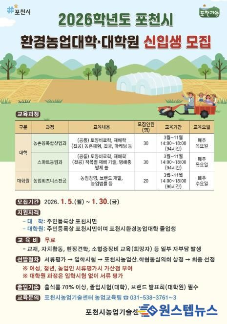 원스텝뉴스 이병희 기자 | 포천시는 2026년 1월 5일부터 30일까지 ‘2026학년도 포천시 환경농업대학 및 대학원’ 신입생을 모집한다.