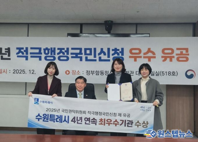 수원시는 24일 정부서울청사 정부합동민원센터에서 열린 2025 국민권익위원회 적극행정국민신청제 우수기관 시상식에서 상장을 받았다. 수원시는 적극행정국민신청제가 도입된 2022년부터 올해까지 4년 연속 우수기관으로 선정되는 성과를 거뒀다.