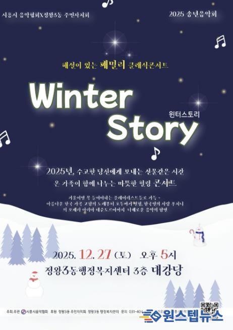 원스텝뉴스 천규영 기자 | 시흥시음악협회는 정왕3동 주민자치회와 협력해 오는 12월 27일 오후 5시, 정왕3동 행정복지센터 3층 대강당에서 2025 송년 음악회 ‘해설이 있는 패밀리 클래식 콘서트, 윈터 스토리’를 개최한다.