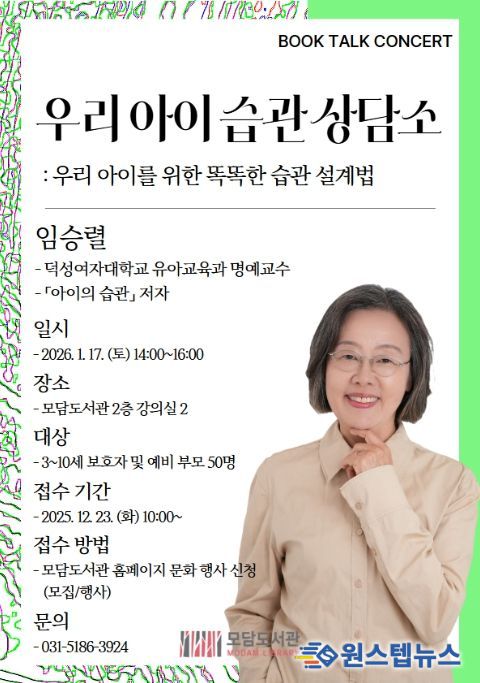 원스텝뉴스 천규영 기자 | 김포시 모담도서관이 2026년 1월 17일 토요일 14시부터 16시까지 3~10세 부모 및 예비 부모를 대상으로 한 상담형 프로그램 '우리 아이 습관 상담소'를 운영한다.
