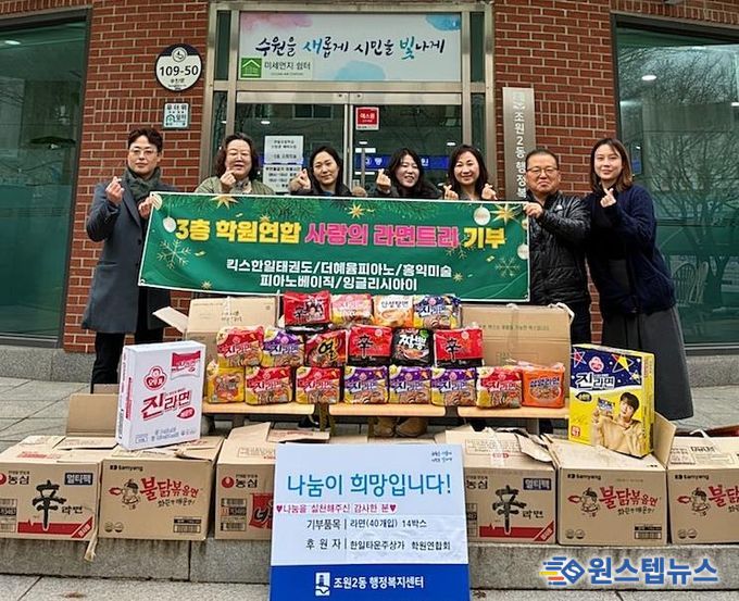 원스텝뉴스 이병희 기자 | 수원시 장안구 조원2동은 지난 24일 관내 한일타운주상가 학원 연합회로부터 어려운 이웃을 위한 라면 40개입 14박스를 기탁받았다고 전했다.