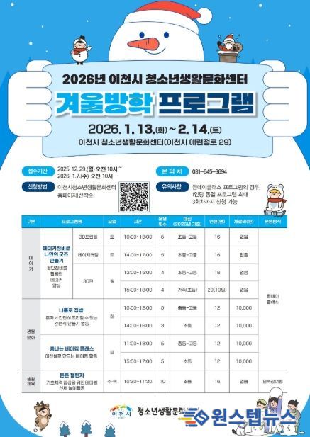 원스텝뉴스 이병희 기자 | 이천시 청소년생활문화센터가 2026년 정식 운영을 앞두고, 관내 청소년들의 알찬 겨울방학을 지원하기 위해 1월 13일부터 2월 14일까지 ‘2026년 겨울방학 프로그램’을 운영한다고 밝혔다.