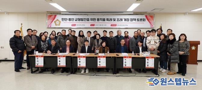 원스텝뉴스 이병희 기자 | 안양시의회 김경숙 의원(국민의힘, 석수1·2동·충훈동)은 12월 24일 시의회 소회의실에서 '만안·동안 균형발전을 위한 용적률 특례 및 조례 개정 정책토론회'를 개최하고, 만안과 동안 간 개발 격차 해소를 위한 다양한 정책 대안을 논의했다.