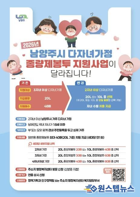 원스텝뉴스 이병희 기자 | 남양주시는 내년 1월부터 ‘다자녀가정 종량제봉투 지원사업’ 대상을 2자녀 이상 가정으로 확대 운영한다고 26일 밝혔다.