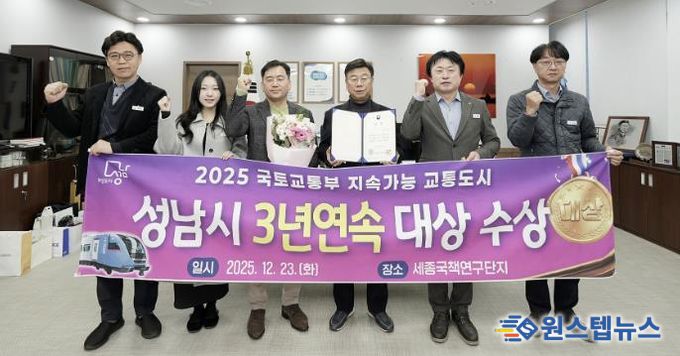원스텝뉴스 이병희 기자 | 성남시가 국토교통부 주관 ‘2025 지속가능 교통도시 평가’에서 대상을 수상하며 3년 연속 최고 평가를 받았다. 2023년과 2024년에 이어 올해까지 연속 수상을 이어가며, 친환경 교통 정책과 대중교통 중심 도시 전략의 성과를 다시 한번 입증했다.