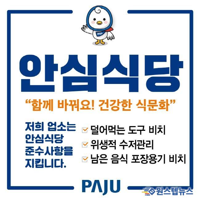 안심식당은 식사 문화 3대 개선 과제인 ▲덜어 먹기 가능한 도구 비치 및 제공 ▲위생적인 수저 관리 ▲남은 음식 포장 용기 비치 여부를 모두 충족하는 음식점이며, 파주시는 현재 200개소를 안심식당으로 지정해 운영 중이다.