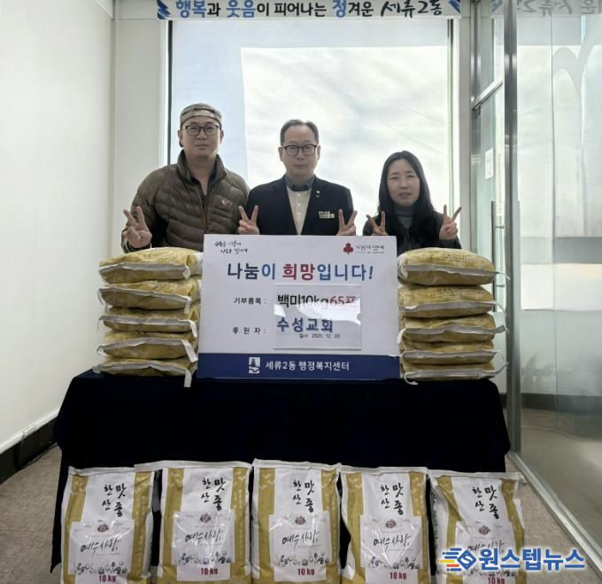 원스텝뉴스 이병희 기자 | 지난 20일, 수원시 권선구 세류동에 소재한 수성교회는 연말연시를 맞아 세류2동행정복지센터에 백미 10kg 65포를 후원했다.