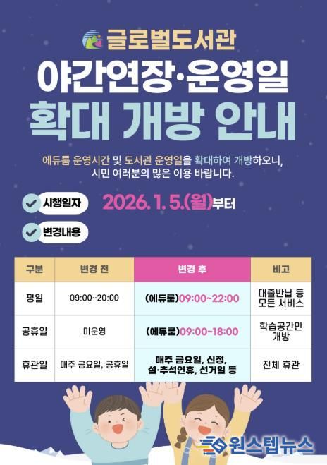 또한, 글로벌도서관은 기존 공휴일에 운영되지 않던 에듀룸 학습공간을 오전 9시부터 오후 6시까지 개방해 학생과 시민들의 안정적인 학습 활동을 지원할 계획이다.