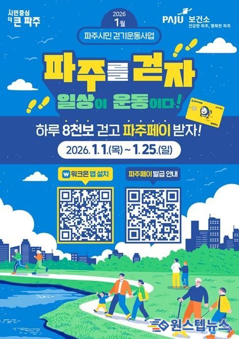 원스텝뉴스 이병희 기자 | 파주보건소는 2026년 새해를 맞아 시민들의 건강한 생활습관 형성과 일상 속 걷기 실천을 응원하기 위해 1월 1일부터 25일까지 모바일 걷기 앱 ‘워크온(WalkOn)’을 활용한 ‘걷기 챌린지’를 운영한다고 밝혔다.