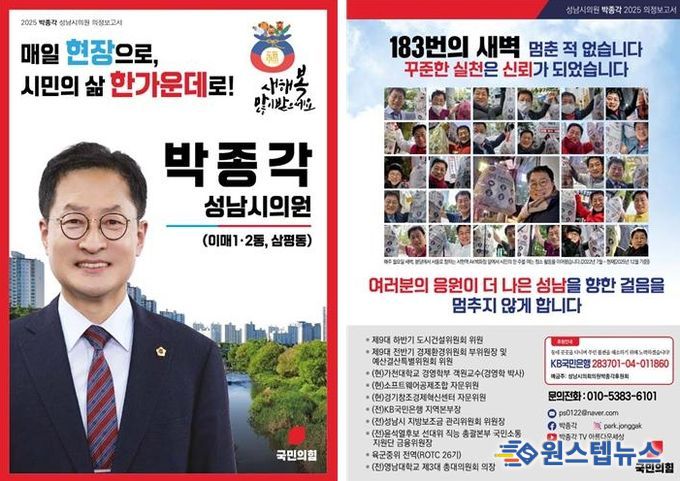 원스텝뉴스 이병희 기자 | 성남시의회 박종각 의원(국민의힘, 이매1·2동·삼평동)이 2025년 의정활동 성과를 정리한 의정보고서를 발간했다. 제9대 시의회 임기 동안 현장을 누빈 활동과 지역 민생 개선의 결과들을 담아낸 내용이다.