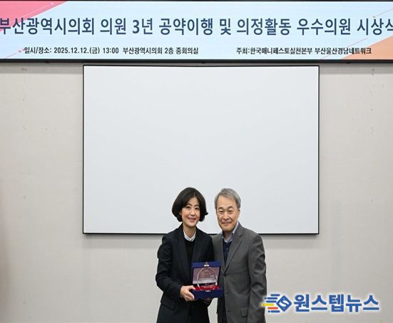 원스텝뉴스 이병희 기자 | 부산광역시의회 김효정 의원(국민의힘, 북구 만덕·덕천)이 2025년 연말, 주요 의정 평가 상을 잇따라 수상하며 북구 출신 시의원 가운데 ‘최다 수상’이라는 독보적인 기록을 달성했다. 중앙과 지방, 유권자 단체를 아우르는 평가 기관들로부터 연이어 대상을 수상하며, 연말 의정 평가를 사실상 “싹쓸이”했다는는 평가를 받고 있다.