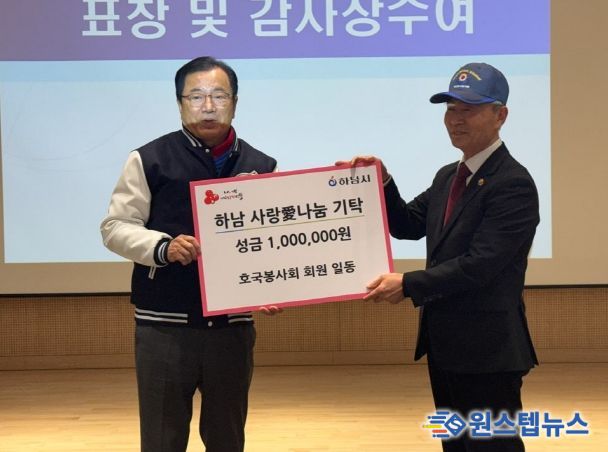 원스텝뉴스 이병희 기자 | 지난 27일, 하남호국봉사회(회장 박규섭)는 ‘하남 사랑愛나눔’ 성금으로 100만원을 하남시에 기탁하며 지역사회 나눔 실천에 동참했다.