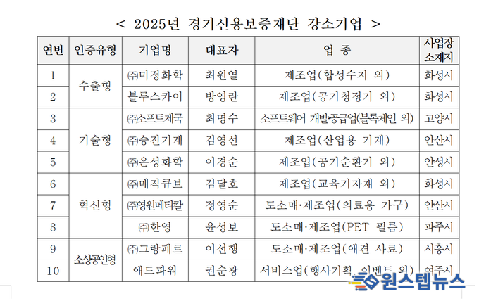 경기신용보증재단(이사장 시석중, 이하 경기신보)은 경기침체 등으로 경영환경이 전반적으로 악화된 상황 속에서도, 기술력과 혁신 역량을 바탕으로 위기를 기회로 바꿔온 ‘강소기업’ 10곳을 30일 선정했다고 밝혔다.