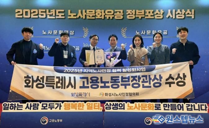 원스텝뉴스 이병희 기자 | 화성특례시는 지난 30일 고용노동부 주관으로 열린 '2025년 노사문화유공 정부포상 시상식’에서 ‘지역노사민정 협력 유공’단체부문 고용노동부장관 표창을 수상했다고 31일 밝혔다.