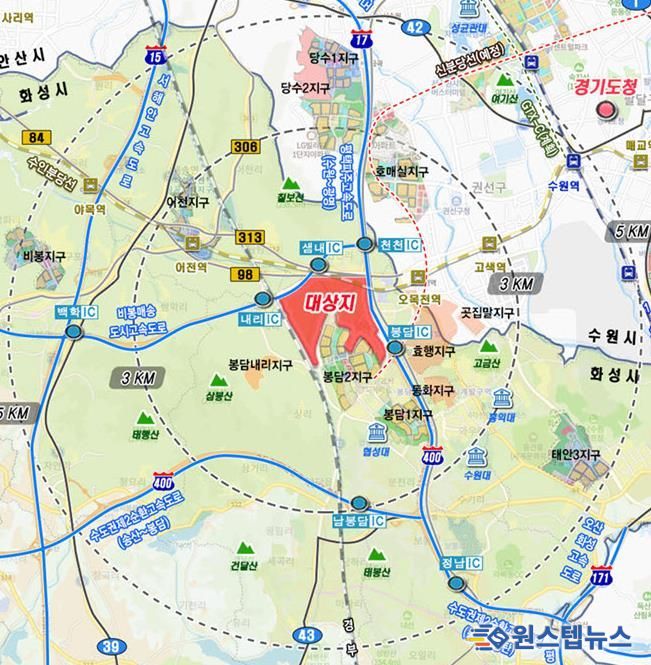 봉담3지구는 화성시 봉담읍(상리·수영리·내리) 및 매송면(천천리·원평리) 일원에 조성되며, 면적은 2,289,715㎡다.