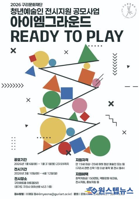 원스텝뉴스 이병희 기자 | (재)구리문화재단은 청년 예술인의 도약과 성장을 지원하기 위한 청년 정책 플랫폼 사업의 일환으로, 2026년 청년 예술인 전시지원 공모사업 '아이엠 그라운드, Ready to Play'에 참여할 예술인을 1월 6일부터 1월 31일까지 모집한다.