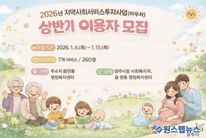 원스텝뉴스 이병희 기자 | 양주시가 2026년 1월 8일부터 1월 15일까지 지역사회서비스투자사업 이용자를 모집한다.
