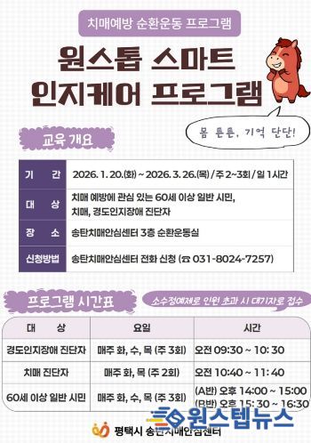 원스텝뉴스 이병희 기자 | 평택시 송탄치매안심센터에서는 치매 예방 및 인지기능 향상을 위한 ‘원스톱 스마트 인지케어 프로그램’ 1기 참여자를 오는 14일까지 모집한다.