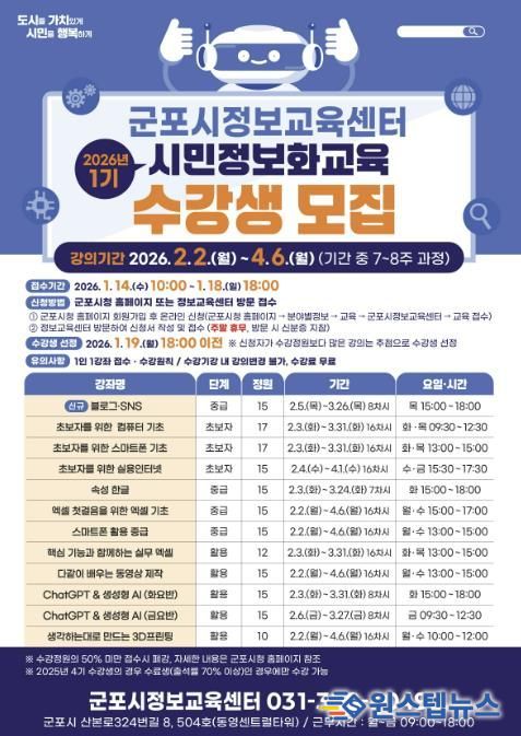 수강신청은 2026년 1월 14일 오전 10시부터 1월 18일 오후 6시까지 가능하며 군포시청 홈페이지 또는 군포시 정보교육센터(산본로324번길 8, 504호, 주말 휴무) 방문을 통해 신청할 수 있다.