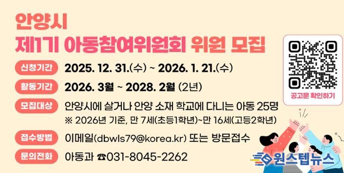 원스텝뉴스 이병희 기자 | 안양시는 이달 21일까지 아동들이 시의 주요 정책 및 사업 추진 과정에 직접 참여하여 의견을 제시할 수 있는 ‘안양시 아동참여위원회’의 제1기 위원을 모집한다고 6일 밝혔다.
