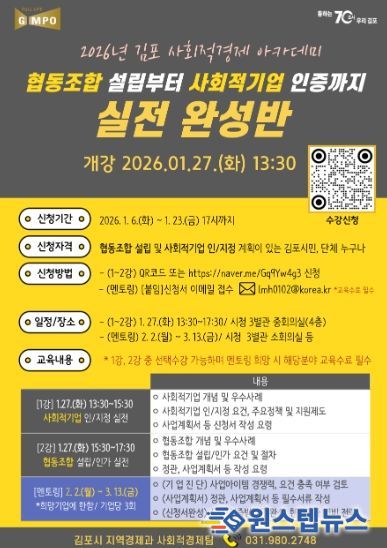 원스텝뉴스 이병희 기자 | 김포시가 사회문제 해결을 위한 참신한 아이디어와 실행력을 갖춘 사회적경제기업 육성을 위해 '2026년 김포시 사회적경제 아카데미'를 개설하고, 오는 1월 23일까지 수강생을 모집한다.