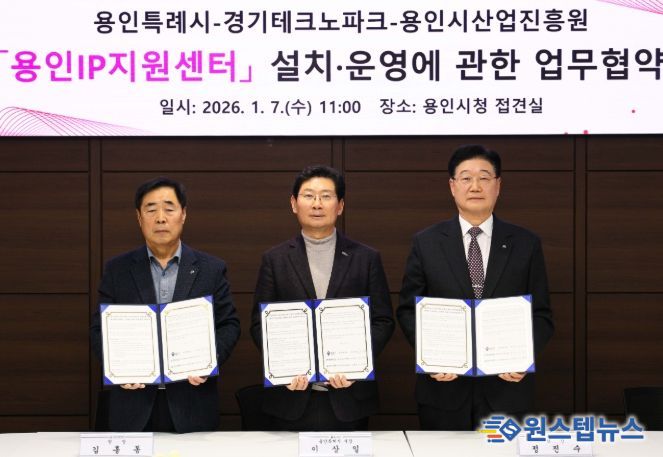 원스텝뉴스 이병희 기자 | 용인특례시는 7일 시청 접견실에서 경기테크노파크, 용인시산업진흥원과 '용인IP지원센터 운영에 관한 상호협력 협약'을 체결했다.