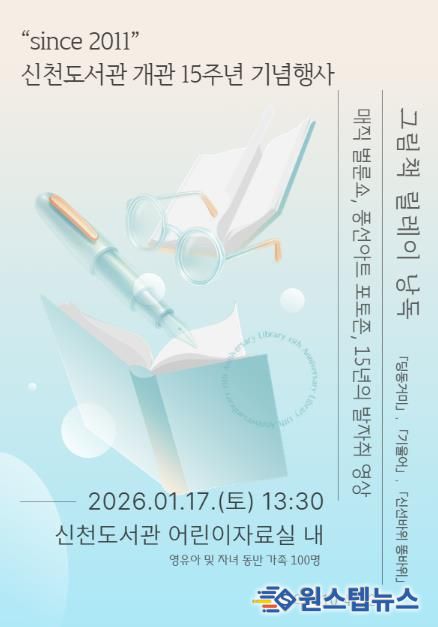 원스텝뉴스 이병희 기자 | 시흥시는 오는 1월 17일 신천도서관에서 ‘개관 15주년 기념행사’를 열고, 유아동 및 어린이 동반 가족 100여 명을 대상으로 그림책 낭독과 마술 공연을 운영한다. 행사는 이날 오후 1시 30분부터 3시 30분까지 진행된다.
