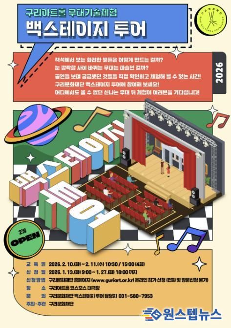 원스텝뉴스 이병희 기자 | 구리문화재단은 〈무대 기술 체험 백스테이지 투어 프로그램〉 참가자를 오는 1월 13일 오전 9시부터 1월 27일 오후 6시까지 재단 홈페이지를 통해 선착순 모집한다고 밝혔다.