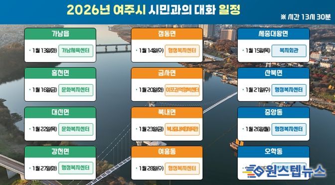 ‘2026년 시민과의 대화’는 △2026.1.13.(가남읍, 가남체육센터) △2026.1.14.(점동면, 행정복지센터) △2026.1.15.(세종대왕면, 복지회관) △2026.1.16.(흥천면, 문화복지센터) △2026.1.20.(금사면, 이포권역행복센터) △2026.1.21.(산북면, 행정복지센터) △2026.1.22.(대신면, 문화복지센터) △2026.1.23.(북내면, 북내실내복합체육관) △2026.1.26.(중앙동, 행정복지센터) △2026.1.27.(강천면, 행정복지센터) △2026.1.28.(여흥동, 여흥체육공원 실내체육관) △2026.1.30.(오학동, 행정복지센터) 순으로 진행된다.