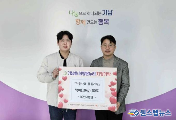 원스텝뉴스 이병희 기자 | 현대환경㈜은 지난 8일, 가남읍 행정복지센터를 방문해 관내 취약계층을 위한 백미(10kg) 50포를 기탁했다.