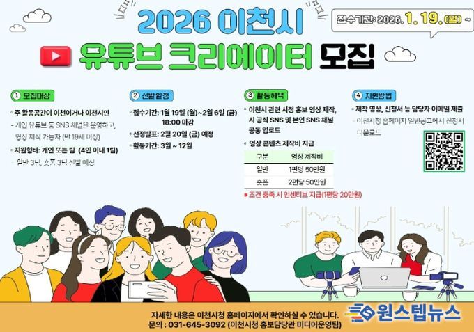 원스텝뉴스 이병희 기자 | 이천시는 오는 2월 6일까지 2026년 이천시 유튜브 영상크리에이터 3기를 모집한다고 9일 밝혔다.
