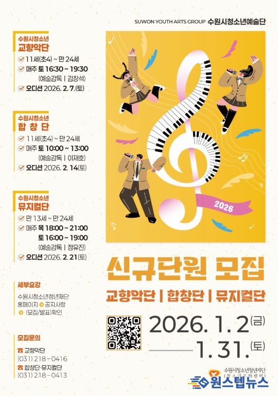 원스텝뉴스 천규영 기자 | 수원시청소년청년재단(이사장 최종진) 수원청소년문화센터는 청소년의 문화예술 역량 강화와 전문 예술 인재 육성을 위해 '2026. 수원시청소년예술단 신규단원'을 모집한다.