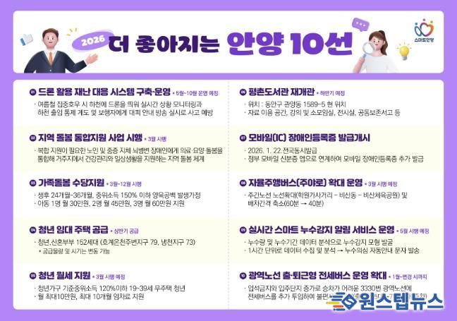 안양시(시장 최대호)는 ▲드론 활용 재난 대응시스템 구축·운영 ▲지역 돌봄 통합지원사업 시행 ▲가족돌봄수당 지원 ▲청년임대주택 공급 ▲안양시 청년월세 지원(사업대상 확대) ▲평촌도서관 재개관 등 ‘2026년 더 좋아지는 안양 10선’을 12일 소개했다.