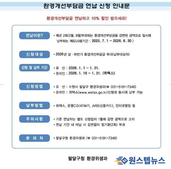 원스텝뉴스 이병희 기자 | 수원시 팔달구는 환경개선부담금 납부 대상자를 대상으로 1월 31일까지 환경개선부담금 연납 신청을 받는다.