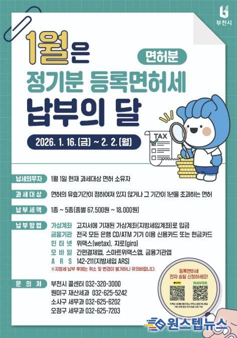 원스텝뉴스 이병희 기자 | 부천시는 2026년 1월 정기분 등록면허세(면허분) 9만 1천 건, 30억 원을 부과했다고 12일 밝혔다.