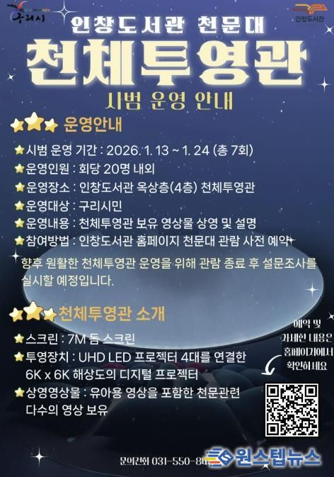 원스텝뉴스 이병희 기자 | 구리시는 오는 1월 13일부터 24일까지 인창도서관 옥상에 설치된 천체투영관의 시범운영을 실시한다고 밝혔다.