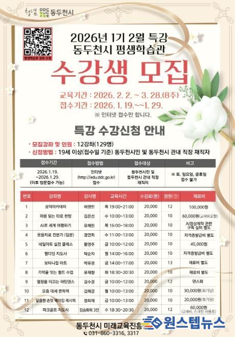 원스텝뉴스 이병희 기자 | 동두천시는 시민의 자기계발과 평생학습 참여 기회를 확대하기 위해 2026년 평생학습관 2월 특강 수강생을 모집한다고 밝혔다.