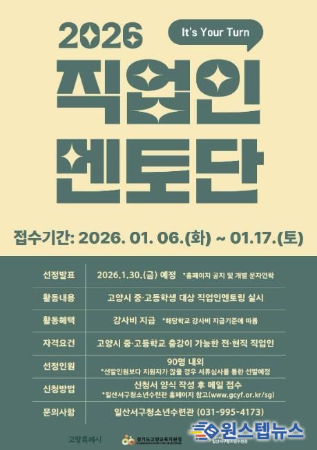 원스텝뉴스 이병희 기자 | 고양시청소년재단 일산서구청소년수련관이 청소년들의 진로 탐색·설계를 지원하기 위한 ‘2026 직업인멘토단’을 모집한다고 밝혔다.