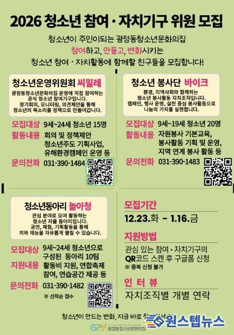 청소년 자치기구 모집은 선착순으로 진행되며, 자세한 사항은 광정동청소년문화의집으로 문의하거나 포스터 내 QR코드를 통해 확인할 수 있다.