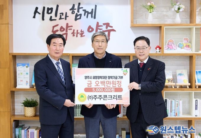 원스텝뉴스 이병희 기자 | ㈜주주콘크리트는 1월 12일 양주시청을 방문해 양주시희망장학재단에 장학기금 500만 원을 기탁했다.